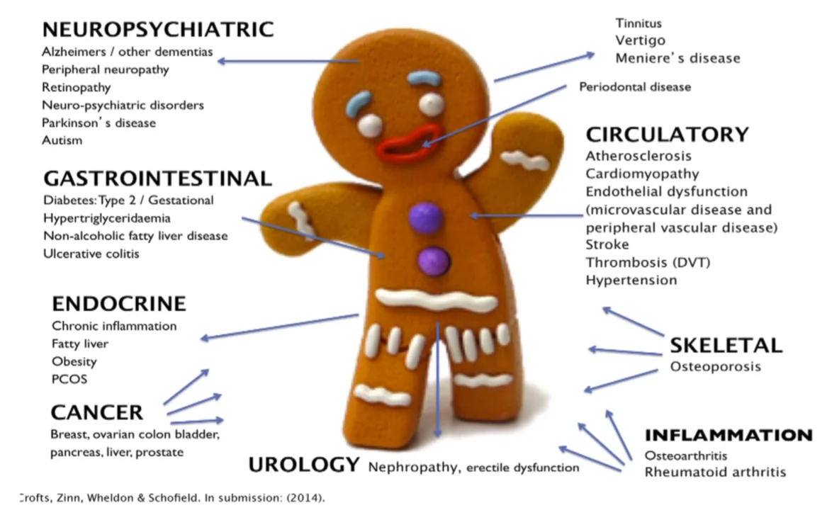 Having a high insulin level (hyperinsulinaemia) is associated with a wide range of serious health conditions, illustrated here in a diagram by Catherine Crofts PhD from University of Auckland.